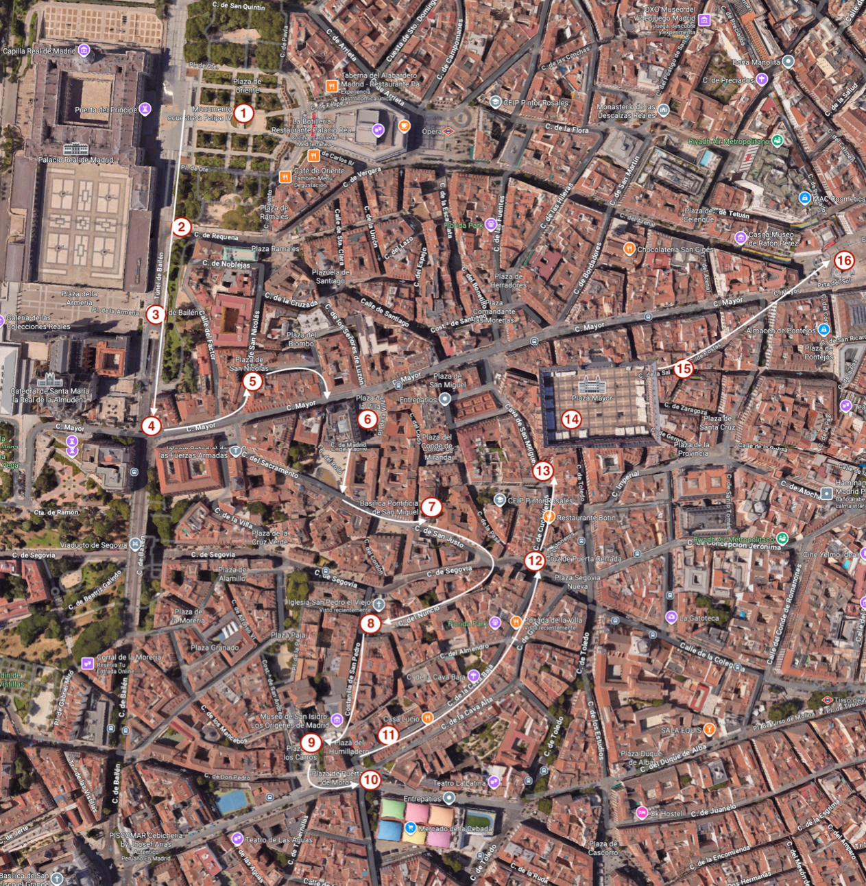 Plaza de Oriente, Iglesia de San Nicolás, Plaza de la Villa, San Miguel, San Pedro el Viejo, Capilla de San Isidro, Plaza de la Cebada, Cava Baja, Plaza de Puerta Cerrada, Plaza Mayor y Puerta del Sol.